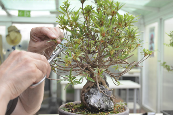 En esta ocasión trabajo una Azalea (Satsuki Kinsai) en roca. A la belleza de este bonsai hay que añadir la particularidad del acompañamiento de una piedra a la que rodean y sujetan las raíces, consiguiendo que se adapten y penetren por sus grietas hasta llegar al suelo.