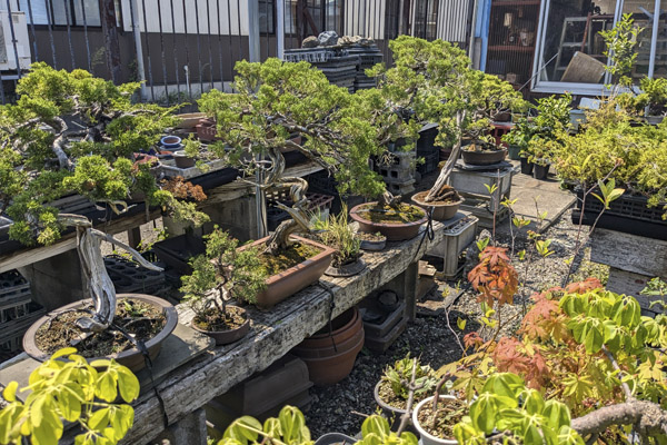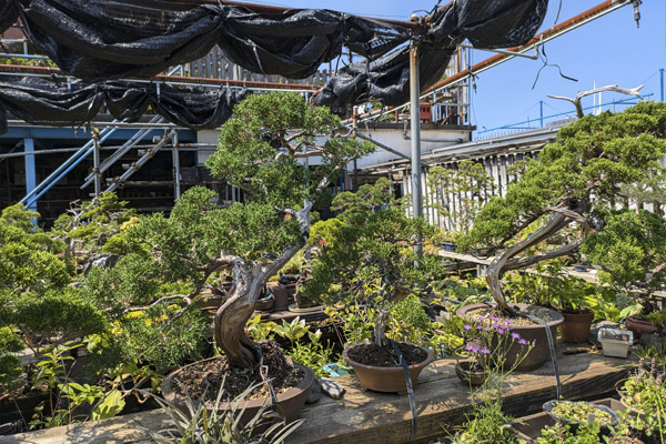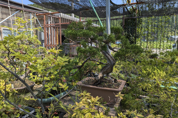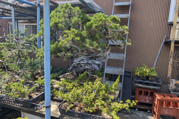 Vimos que como nosotros en Bonsai Colmenar, el patio tenía la posibilidad de cubrirse con malla negra de sombreo. Nos sorprendió que con las temperaturas suaves y con un cultivo casi en exclusiva de juníperos se viera necesitado de esta protección. Preguntamos y la respuesta fue la que en general todos los profesionales del bonsai venimos dando, el sol cada vez es más fuerte y nuestros árboles necesitan de estas protecciones.