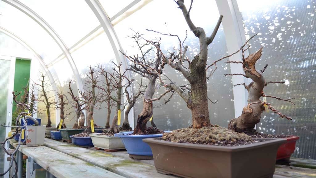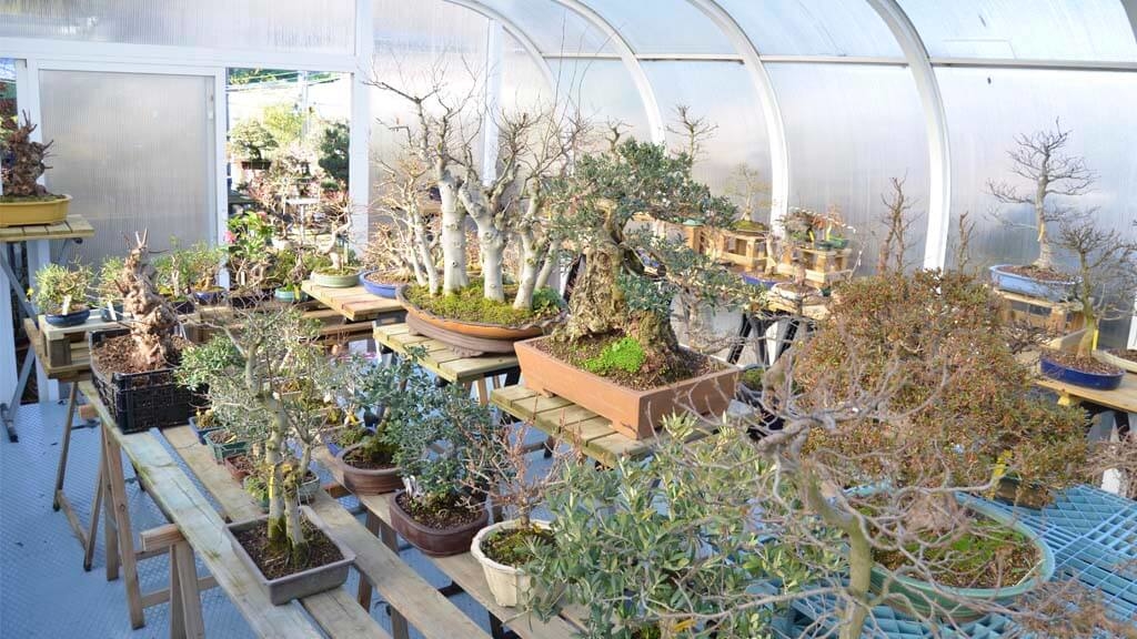 En la zona en la que estamos ubicados, cercanos a la Sierra de Guadarrama en Madrid , las temperaturas bajo cero son habituales durante el invierno, por ello en Bonsai Colmenar habilitamos una zona de invernadero frio donde trasladamos especies que denominamos “mediterráneas”, pyracanthas, olivos, algarrobos, mirtos, etc independientemente de su tamaño o grado de formación, son especies que sufren con el hielo y es preferible que pasen estos días bajo techo.