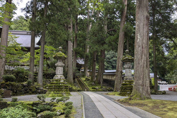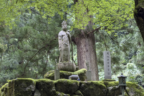 La entrada al recinto de Eihei-ji trascurre por un camino paralelo al rio rodeado de gigantescos cedros, azaleas, arces, estatuas de Kanon, figuras de animales, linternas de piedra y metal cubiertas por brillantes musgos, … Todo cuidado al máximo, la naturaleza, la decoración, la limpieza, hasta los más pequeños detalles están estudiados y tratados con la máxima delicadeza.