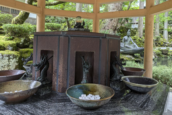 Al inicio encontramos el temizu o lugar de abluciones, son 8 piletas con grifos en forma de dragón, y junto a ello un cartel con las palabras del fundador, Dogen: