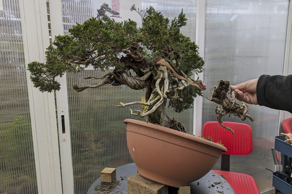 Terminado el trabajo de madera, comencé con el alambrado de ramas, colocándolas en la posición más armónica con la nueva posición del tronco. El alambrado fue muy suave marcando el inicio de lo que serán las futuras masas verdes.