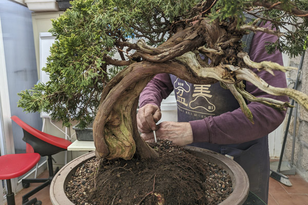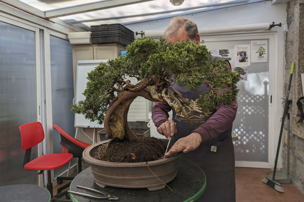 En concreto este ejemplar lleva en Bonsái Colmenar algo más de dos años. Durante este tiempo únicamente nos hemos dedicado a facilitarle su adaptación. El cultivo no ha tenido ninguna complicación y es ahora en la primavera de 2024 cuando nos decidimos por trabajar y trasplantar este prometedor ejemplar.